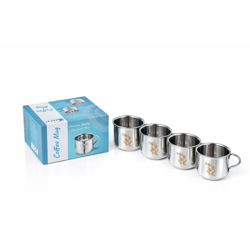 This KTECH STAINLESS STEEL SINGLE WALL TEA CUP 4 PCS SET features four elegantly crafted single-wall tea and coffee cups, designed for durability and daily use. Made from premium-grade stainless steel, these mugs offer a sleek, modern look with a traditional floral touch.