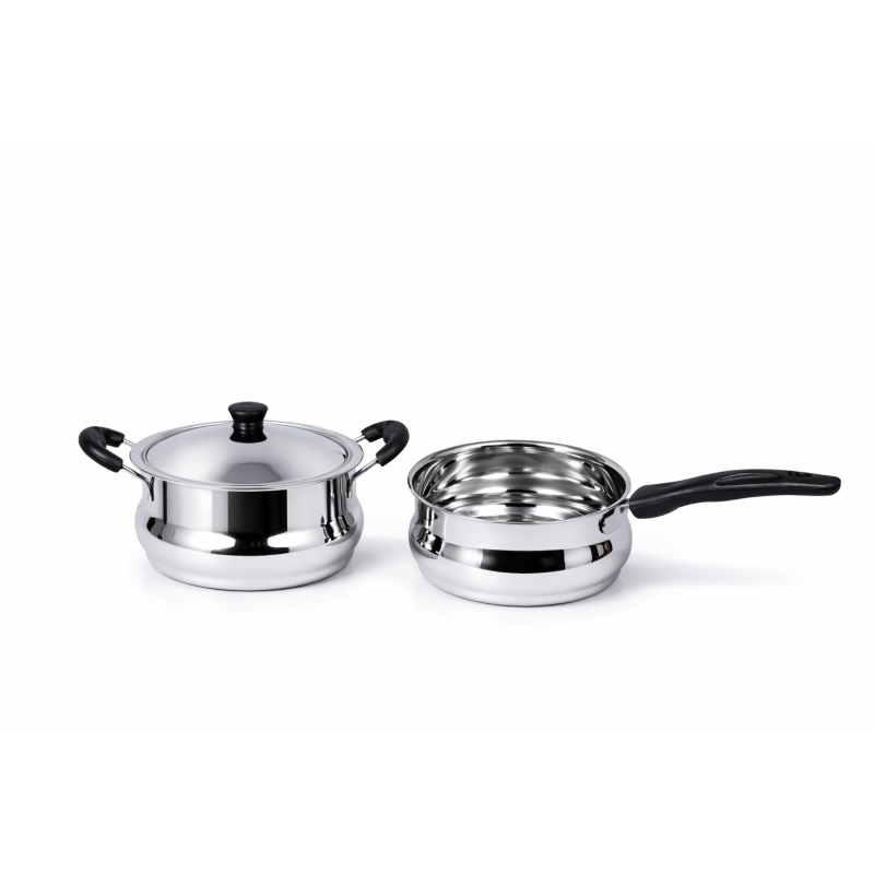 The STAINLESS STEEL 3 PCS COMBO SET - PLATINA is a high-performance cookware duo designed for the modern kitchen that demands both durability and versatility. This essential pair features a premium stainless steel saucepan and a matching pot, making it the perfect foundation for daily cooking tasks. Crafted from high-grade, heavy-gauge stainless steel with a brilliant mirror finish, the Platina series ensures even heat distribution and professional-grade results for everything from boiling milk to simmering rich gravies.